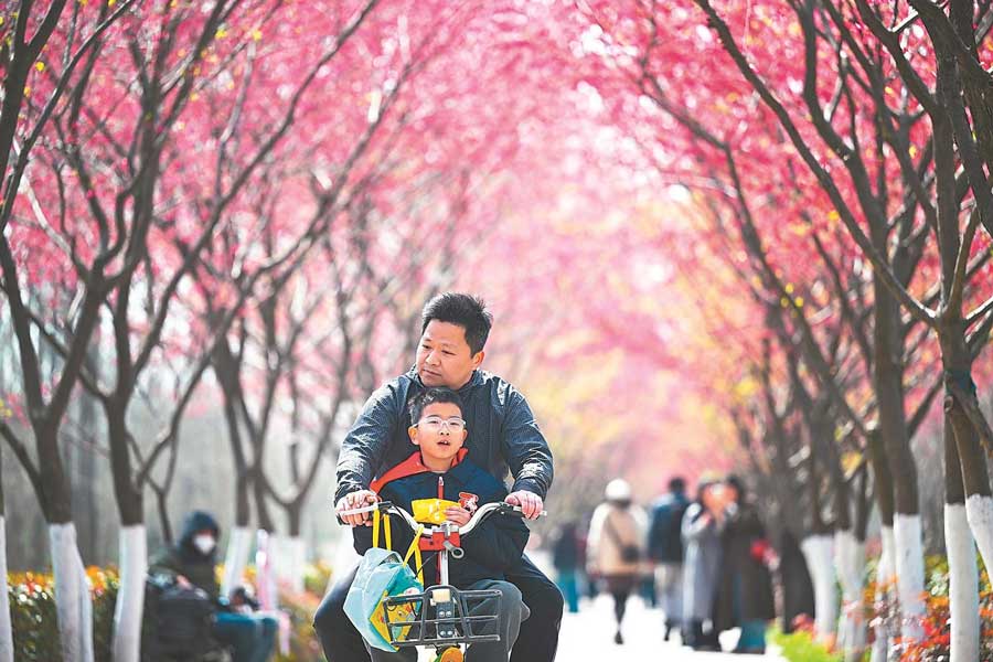 3月7日,游客在合肥滨湖国家森林公园的樱花步道打卡游玩。连日来,樱花步道上的千株樱花迎来了盛花期,吸引众多游人前往拍照打卡。记者 张大岗 摄