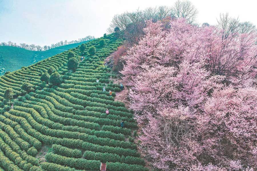 3月8日,芜湖市繁昌区孙村镇水口村茶园樱花绽放,粉色的花朵与绿色的茶垄相映成景,吸引游客前来打卡游玩。通讯员 邢朝明 摄