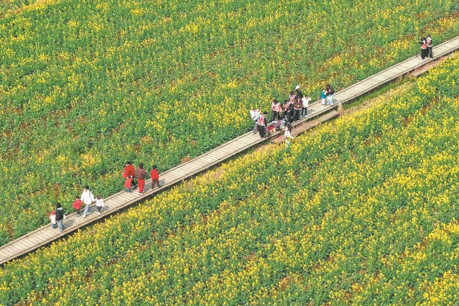 3月7日,铜陵市铜官区西湖镇横塘乡村生态园里的油菜花争相绽放,市民和游客在金黄的花田里踏青赏花,感受大好春光。通讯员 储著传 摄