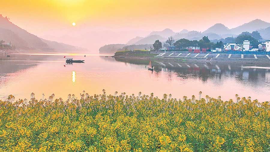 近日,歙县新安江畔,金黄的油菜花竞相绽放,白墙黛瓦的徽派民居倒映在澄澈江面,勾勒出江南春日最温柔的模样。