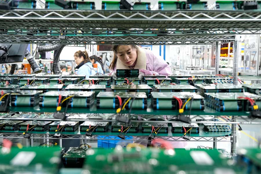 3月17日,五河县一家锂电池生产企业,工人在查看电池产品。近年来,五河县扎实推进新型能源体系建设,推进全县锂电企业的数字化与智能化改造进程。本报通讯员 李向前 摄
