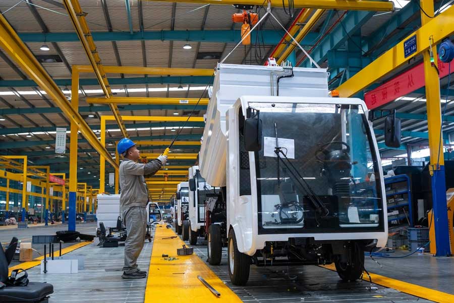 3月17日,芜湖市繁昌经济开发区安徽爱瑞特新能源专用汽车股份有限公司生产车间内,工人们在赶制新能源电动清扫车,满足市场需求。本报通讯员 肖本祥 摄