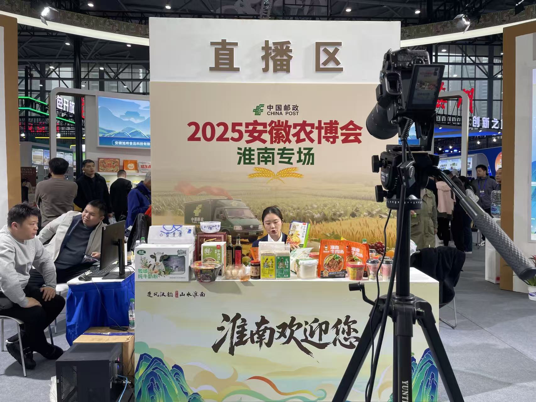 进入淮南展区,记者看到设置的直播区“2025安徽农博会淮南专场”,主播正在介绍牛肉汤拉面,直播台上摆着淮南牛肉汤、店集贡米、西瓜酱等淮南特色食品,搭配限时优惠套餐吸引大量流量。