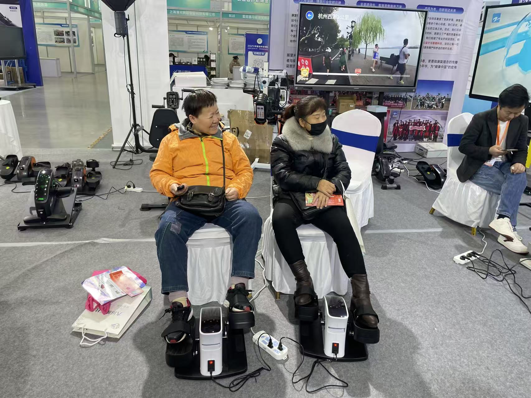 浙匠科技有限公司展厅内,刘女士和朋友脚穿健步仪现场体验这款产品。“除了您关注的健步仪,我们还带来了多款居家康复器,覆盖不同年龄段、不同需求的老年群体,适配居家康养场景,助力老年人日常康复训练。”销售人员史女士向她们介绍道。