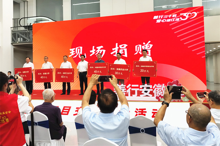 会上,与会领导宣读了2024年“慈善一日捐”活动倡议书。现场捐赠环节,安徽省慈善总会接受爱心企业捐赠,除阳光电源、亚德客、华恒生物等企业捐赠大笔资金外,中乔体育和尧舜智能分别捐赠了大量体育物资和生活物资,省政协书画研究院捐赠了近百幅书法绘画作品。同时,中国科学技术大学、合肥工业大学、安徽大学等高校举行了高校助学活动捐赠。