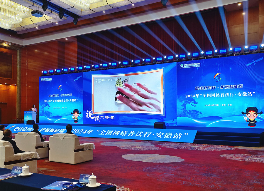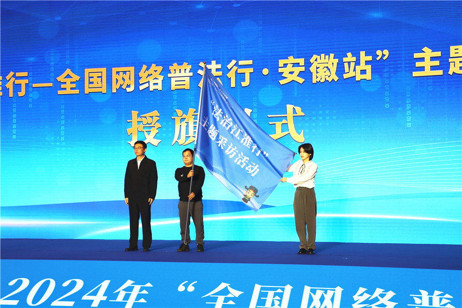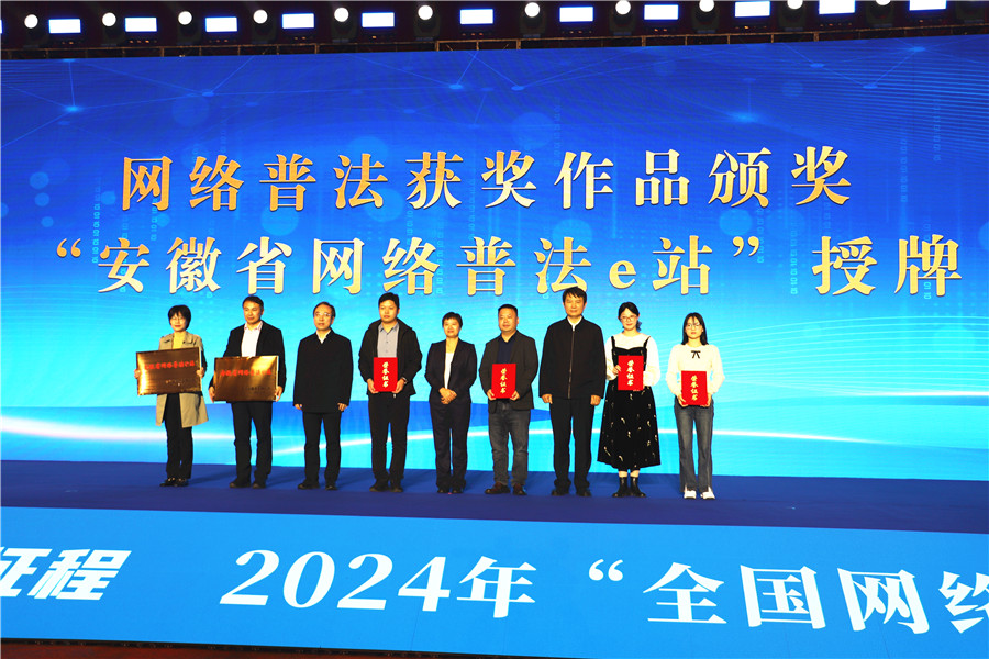 此外,现场发布了网络普法作品、法治论文征集等优秀作品及知识竞赛获奖情况并颁奖,为“安徽省网络普法e站”授牌。仪式现场还为“法治江淮行—全国网络普法行·安徽站”主题采访活动进行了授旗。