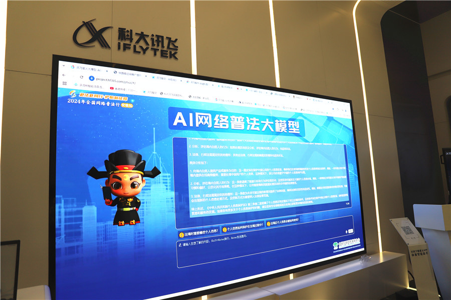 “根据《中华人民共和国民法典》和《中华人民共和国个人信息保护法》,自然人的个人信息受到法律保护,任何组织和个人不得非法收集、使用、加工、传输他人个人信息……”在科大讯飞展厅内,AI网络普法大模型对咨询者提出的“作为网民,我该怎样依法保护好网上个人隐私信息”专业法律问题对答如流,快速输出有关个人信息保护的法律内容。它不仅具备了高度智能化的“法律思维”,还能通过对话的方式,为咨询者提供包含相关法律法规、分析、案例等在内的全方位解答,极大地提高了网络普法的针对性和实效性。