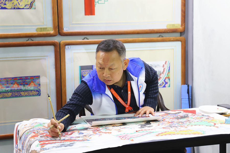 彩画展台的墙上,展示了精美绝伦的古建筑彩画图案。据园林古建彩画传承人江永良介绍,彩画经过风吹日晒后可能会出现脱落掉色等情况,这时候就需要彩画传承人进行修复。江永良曾参加过颐和园的彩画修缮工作,他说:“修复过程十分复杂,要一点一点地描画,非常需要耐心和娴熟技艺。”在他看来,古建彩画传承不能断,希望能够有更多年轻人喜欢并传承古建彩画技艺,让古建彩画后继有人。展区重点展示了中国传统建筑的发展历程、营造规则、人文底蕴、当代价值,以及新时代以来在城乡建设中历史文化保护传承所取得的成绩,以引领更多有识之士投身传统建筑保护修缮事业中来。