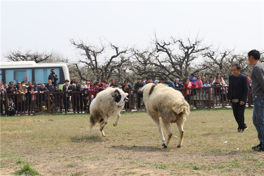 梨园内的一块展板上写着“2019中国砀山梨花艺术节开幕式”以及“3月15日-4月15日”的字样。目前,梨树枝头上刚刚冒出新芽,还未开花,千亩花海是无缘得见了。不过,梨园内的各种热闹活动,还是值得一看。这边,一群穿着红黄相间帅气服装的孩子正在表演激昂的大鼓;那边,砀山唢呐声音清越,砀山四平调唱腔优美,两者皆为国家级非物质文化遗产;这厢,斗羊、斗鸡战况激烈,围观者喝彩声不绝;那厢,书法、面塑等作品展台前围满了人,个个兴致浓厚。