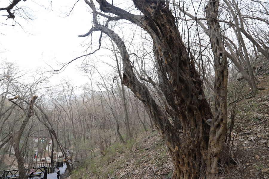 皇藏峪国家森林公园森林覆盖率为97%,有地球同纬度保存最完好的原始森林,素有“幽谷胜地 天然氧吧”之美称。这里千年古树繁多,一路上时不时地就能看到。树龄1000年以上的古树名木有1200多棵,黄杨、银杏、腊梅、桂花、侧柏等,尤其是与“黄山迎客松”齐名的古青檀,大自然的鬼斧神工造就了其奇形怪状,表皮斑驳长满疙瘩,干形凹凸。树与树之间盘根错节连成一片,有的挺拔雄健、顶天立地,有的驼背弓腰、老态龙钟。它们盘根于石缝之中,枝高耸天,向世人展示着饱经风霜的岁月痕迹和极其顽强的生命力。