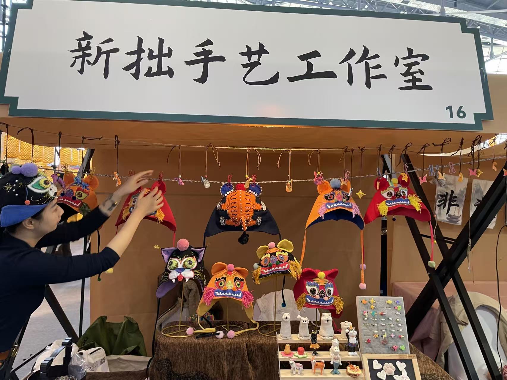 不远处的新拙手艺工作室展位上,合肥手艺人产飞燕正忙着向顾客介绍样式各异的虎头帽:“这次书会我带来的虎头帽,是在母亲传授的传统手艺基础上做的创新,比如这款原创猫头帽,每一顶的配色、造型都不一样,都是独一无二的。”她一边展示着手中的作品,一边说道,“希望通过这种非遗创新,让老手艺‘活’起来,把咱们的文化基因一代代传下去。”从传统虎头帽到创意猫头帽,一针一线间皆是对非遗技艺的坚守与创新,让古老的帽饰文化在当代焕发新的魅力。