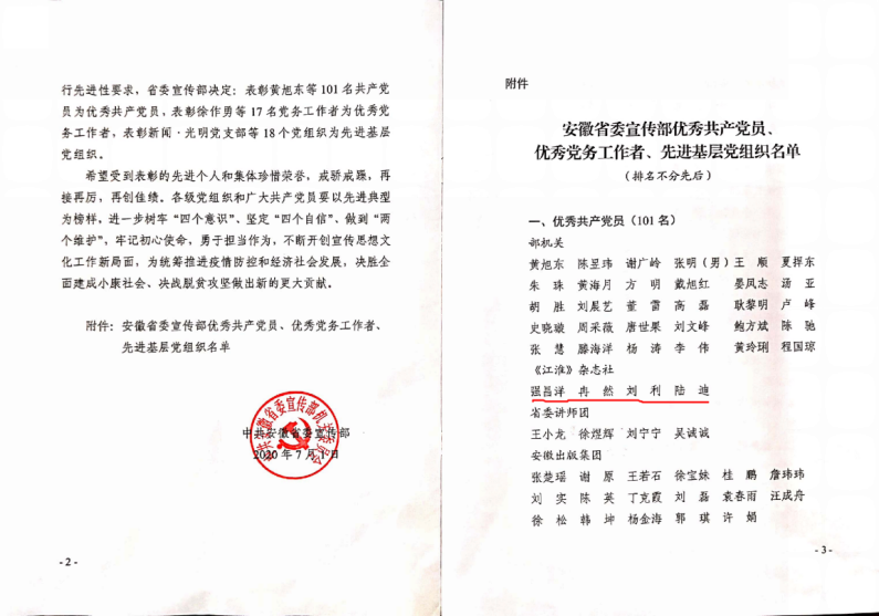 江淮杂志社强昌洋、冉然、刘利、陆迪四人表彰为优秀共产党员,政治理论部党支部表彰为先进基层党组织。