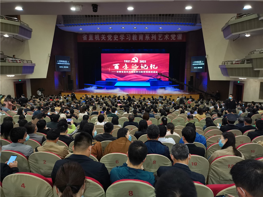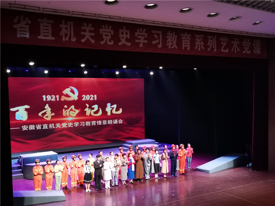 本网讯(记者 史洪芳)4月23日上午,省直机关党史学习教育系列艺术党课红色经典诵读会《百年的记忆》在安徽大剧院举行,通过诵读、情景演绎、歌舞等多种形式生动展现了1921年至2021年的波澜壮阔的中国共产党历史。