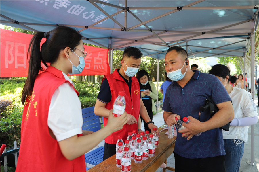 中午11点,围在门口焦急等待的人群越来越密集,虽然家长们被晒得汗流浃背,却仍翘首企盼。志愿者们纷纷给来往的家长递饮水,同时开始协助人群疏散引流。下午4点30分,有位年轻家长脸色苍白,因低血糖在服务台附近晕倒,志愿者们眼疾手快及时接住,帮忙叫来值班医生诊断并给患者喂糖,第一时间解决了突发事件。