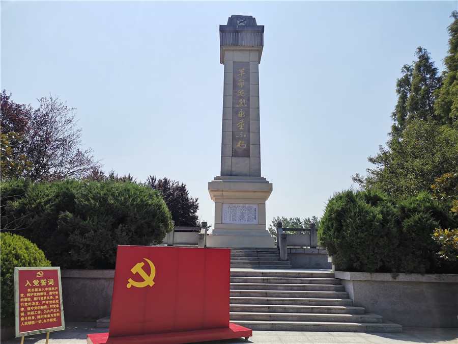 小甸集特支纪念馆外,鲜红色的安徽第一面党旗雕塑格外引人注目,党徽连接着五面旗帜,象征着安徽最早的党组织——中共小甸集特支的五位成员。与雕塑遥相呼应的是烈士纪念塔,上书:“革命先烈永垂不朽”八个大字,“先烈抛头颅洒热血,丰功伟绩,彪炳史册,浩气长存。”党员们仔细阅读碑文,了解寿县革命先辈们披荆斩棘的奋斗历程。在纪念塔前,党员们重温入党誓词,不忘初心,牢记使命。